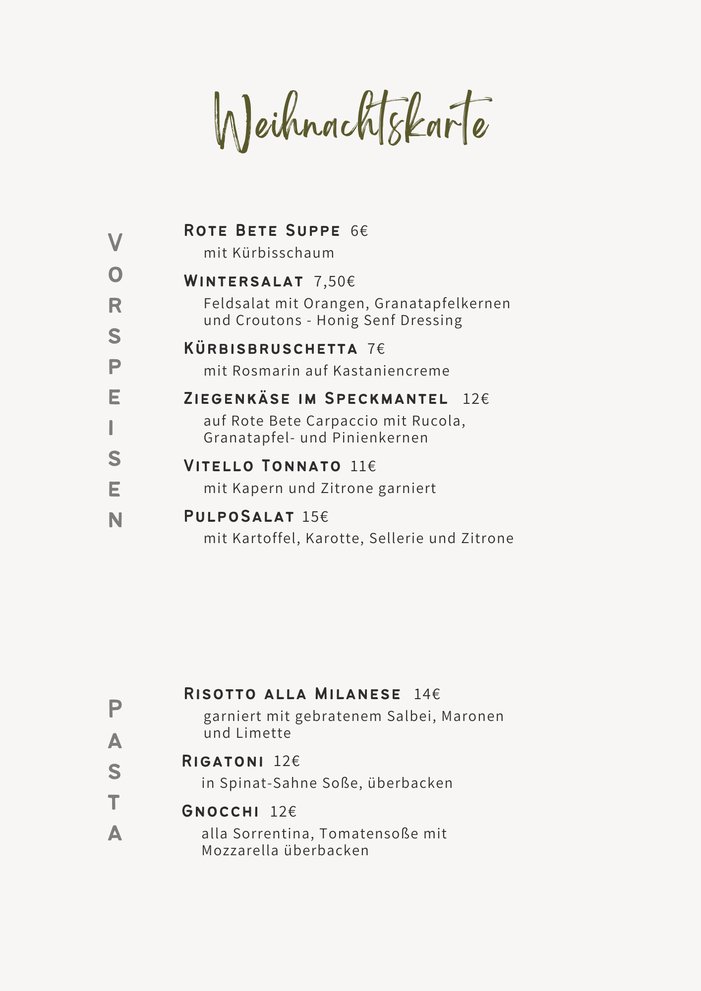Wir freuen uns, Sie über die Feiertage mit unseren Gerichten begleiten zu dürfen. Falls Sie Lust auf eine Pizza haben, ist das natürlich gar kein Problem.