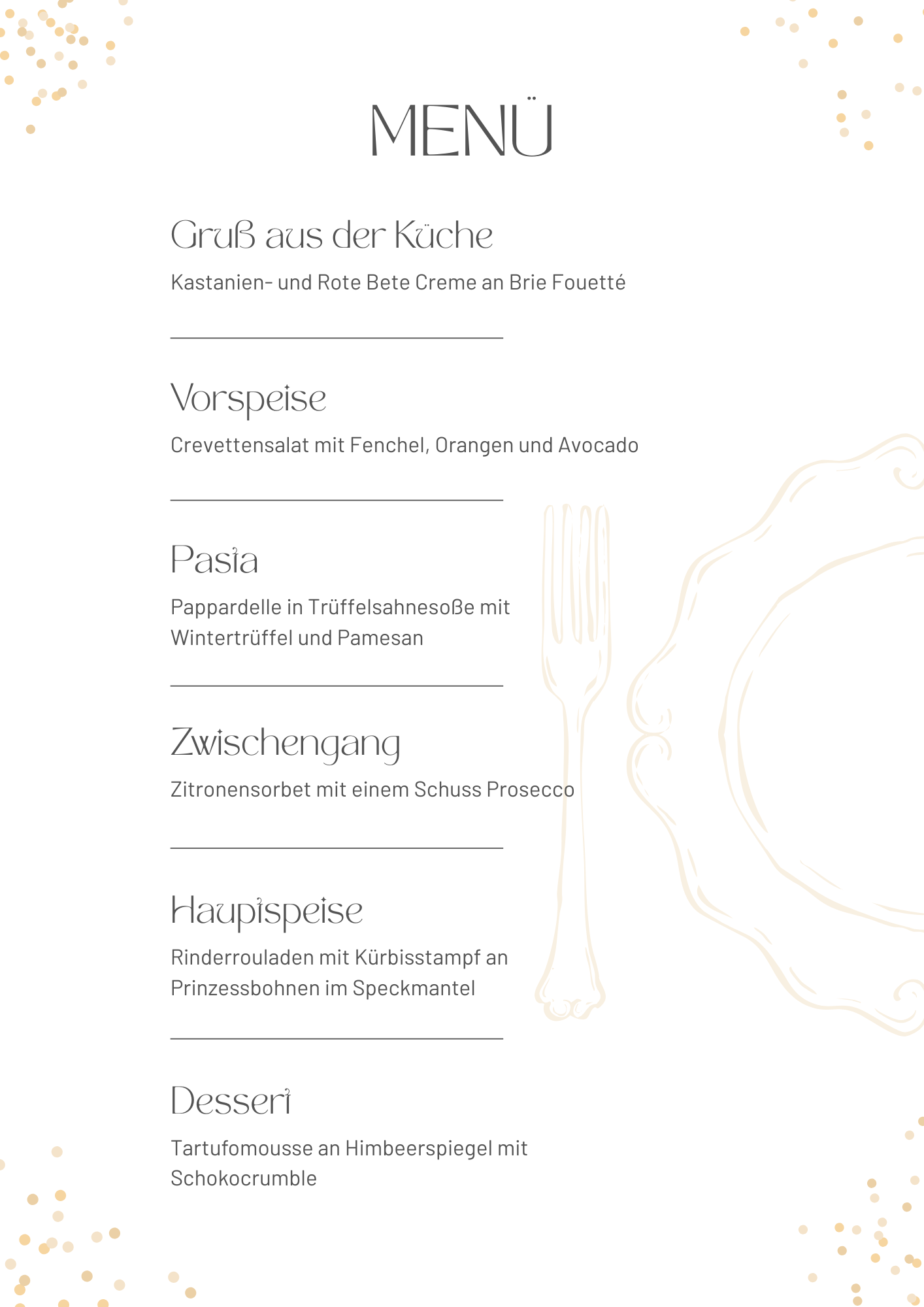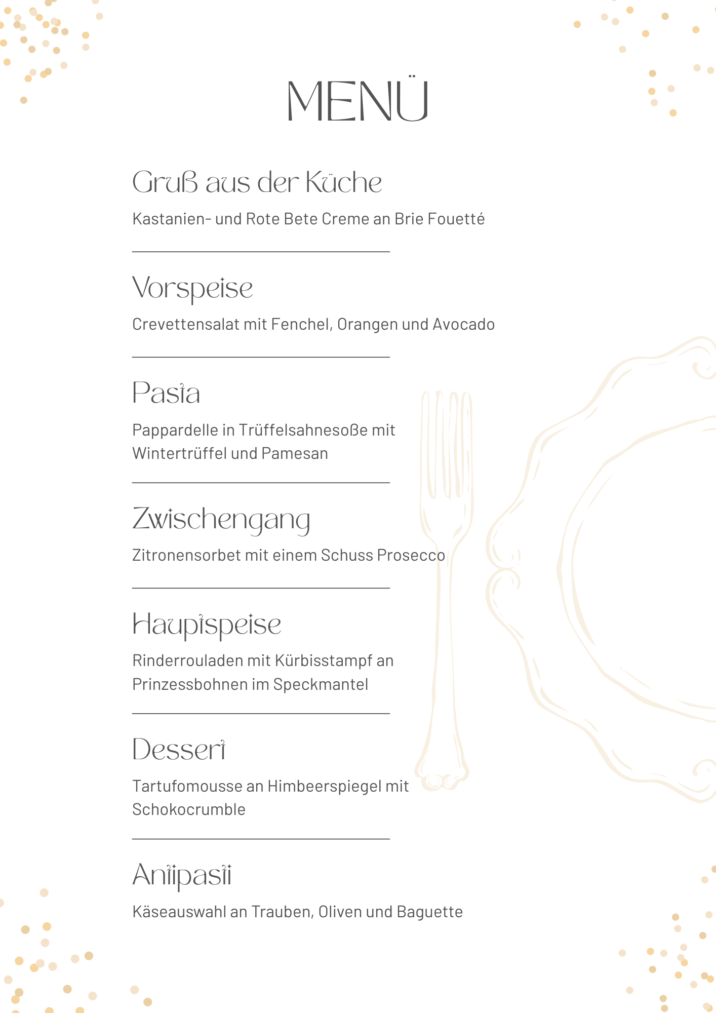 Unser Menü 1 begleitet Sie über den Abend mit verschiedenen Gängen. Geplantes Ende ist ca. 22:30 Uhr für die, die vor 00:00 Uhr Zuhause sein möchten.